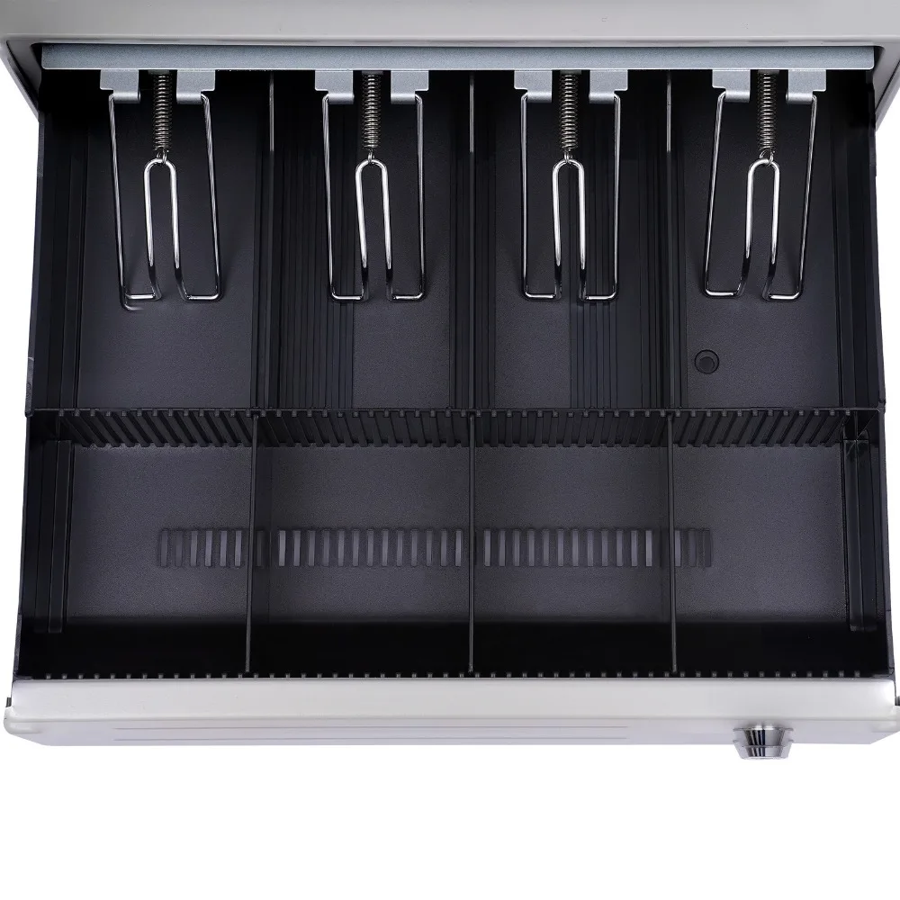Cajón:La caja registradora está equipada con un cajón, que se puede abrir automáticamente durante el funcionamiento normal, y está equipada con cuatro cajas para notas y cuatro cajas para monedas para un fácil almacenamiento.Cada caja de billetes está equipada con un clip para organizar notas.